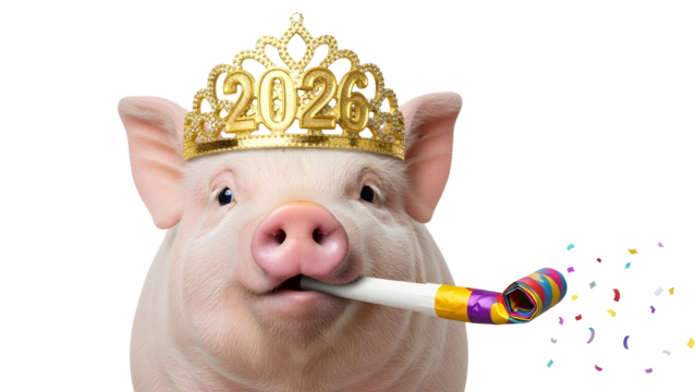 Cute piglet celebrating New Year 2026 wearing a gold tiara and blowing a party horn isolated PNG with Transparent Background
