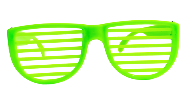 Front of green glitter glasses in the shape of Christmas trees. Isolated cutout on a transparent background