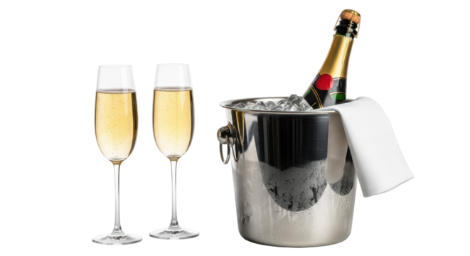 Two champagne flutes clinking together with a splash of bubbly liquid isolated on transparent background