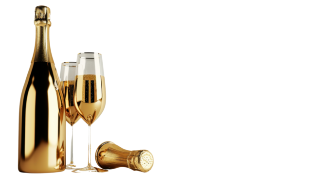 Champagne bottle and flute glass on transparent background