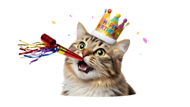Cute funny tabby cat wearing Happy Birthday party hat and blowing noise maker isolated on white background.
