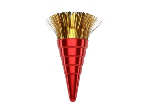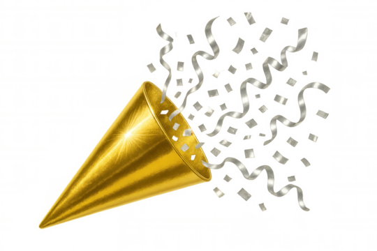 A golden party popper releasing a burst of shimmering gold confetti, symbolizing celebration and joy.