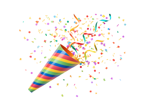 Colorful confetti and streamers exploding from a party popper, transparent background