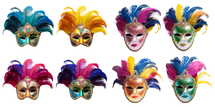 Ornate peacock feather masquerade mask isolated on transparent background, PNG