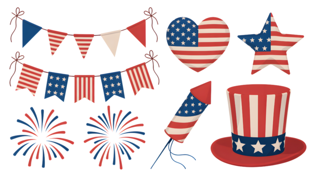 Vibrant collection of patriotic american celebration elements for independence day isolated on transparent background