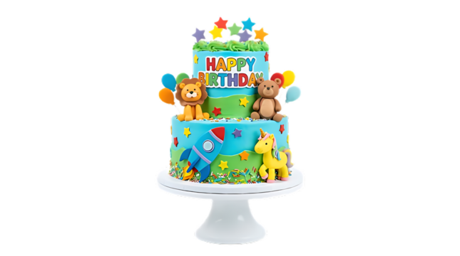 Vibrant birthday cake with teddy bears and unicorn for kids party