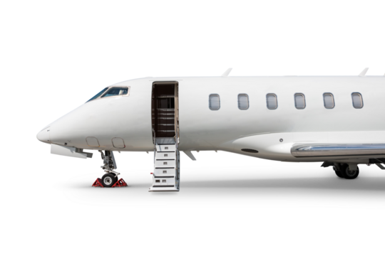 Close-up of the front of the modern white private jet with an opened gangway door isolated on transparent background