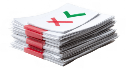 Stack of papers with passing and failing test results marked with a green checkmark and a red x, with red sticky notes separating sections, isolated on a transparent background