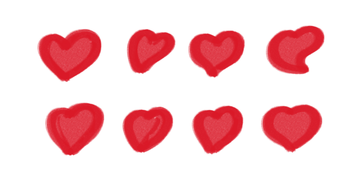 Hand Drawn Red Painted Heart Icons Set with Artistic Brush Stroke Texture on White