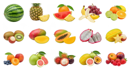 Photo of a vibrant collection of fresh, exotic fruits, including watermelon, pineapple, mango, and berries, on white
