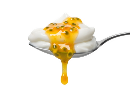 Spoon holding coconut yogurt, with passion fruit sauce trickling over, isolated on white or transparent background. PNG