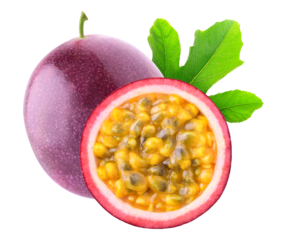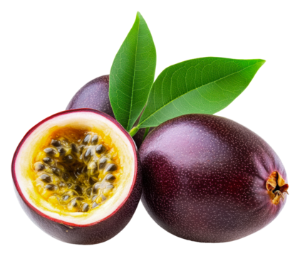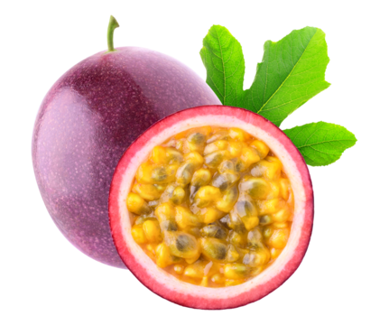 Ripe passion fruit with fresh green leaf isolated on white background. Suitable for marketing or business purposes. PNG file