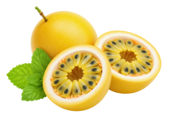 Fresh yellow granadilla fruit PNG isolated on transparent background, passionfruit halves with seeds and mint leaves
