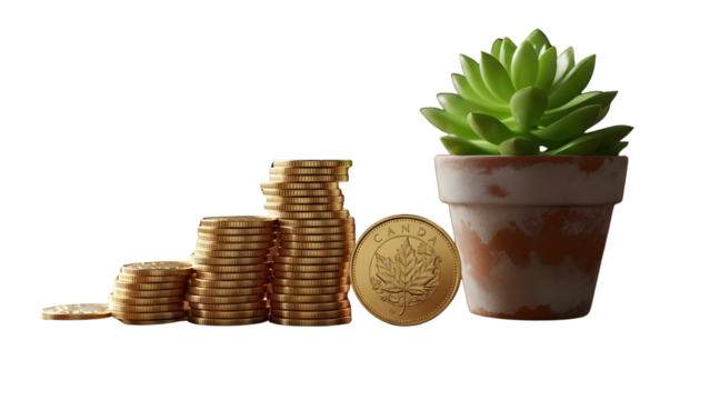 Golden plants sprouting from rising coin stacks, representing financial growth on clear background