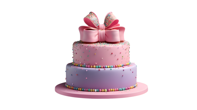 A two-tier birthday cake in pink and purple pastel colors, decorated with sprinkles and a large bow, a 3D illustration isolated on a white background. pink birthday cake isolated