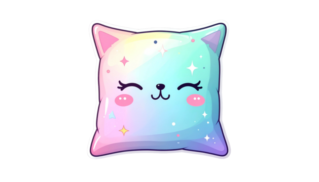 Cute pastel cat-shaped pillow with closed eyes, blush, and sparkles on a black background
