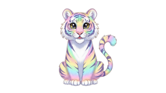 Whimsical cartoon cat with rainbow fur and striped sweater on transparent background