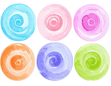 Six vibrant, watercolor-style circular swirls in various pastel colors