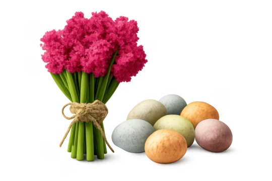 Meticulously arranged soft pastel Easter eggs with whimsical floral patterns, nestled in lush green grass and white spring flowers, macro shot, transparent background, festive Easter celebration