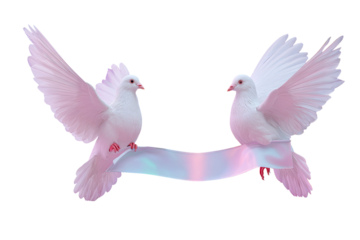 Two white doves in flight, holding a ribbon