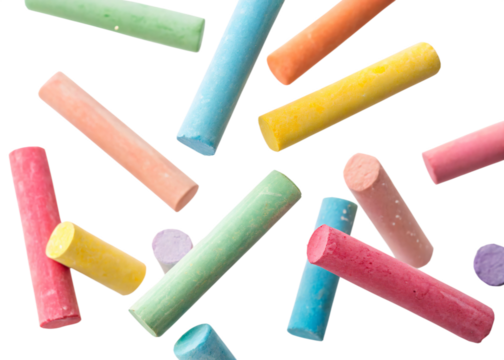 Crayon collection of neon pastel wax sticks, blunt-tipped with paper bands, bright shades from yellow to aqua, fanned display, isolated on transparent background.