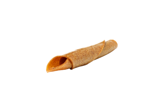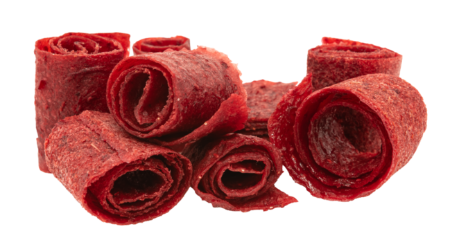 Pastille rolls. Fruit peel in pieces. Raw food diet, vegan sweets, dessert without sugar and flour. Red fruit rolls on a white background. Healthy eating