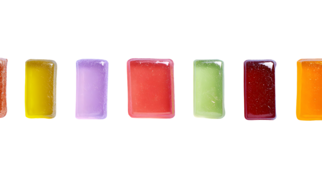 A vibrant row of colorful translucent sugar-coated rectangular fruit jelly candies.