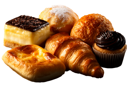 Confident cafe staff displaying assorted gourmet pastries on transparent background