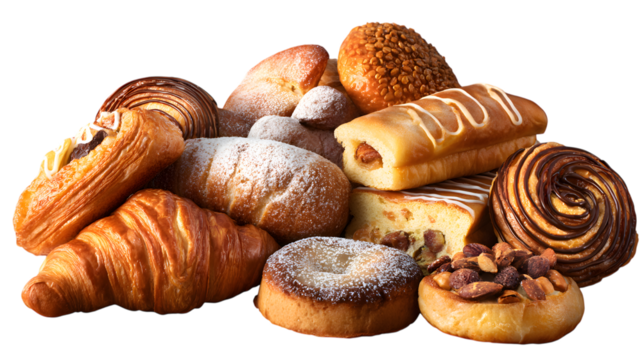 Assortment of delicious baked pastries including croissants danishes doughnuts and bread against a isolated on white transparent background PNG cutout