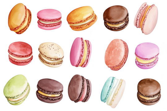colorful assorted stacked sweet macarons variety of vibrant pastry cookies dessert snacks arranged on white background