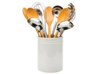 Kitchen utensils in a white ceramic container on transparent background