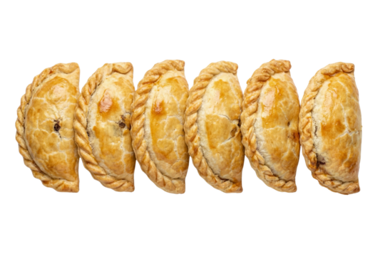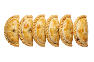 Delicious row of golden brown baked pasties or empanadas on a pristine white background
