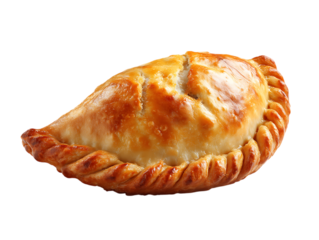 A delicious freshly baked golden brown empanada, savory pasty or hand pie with a crispy crimped crust, Isolated on Transparent and White Background