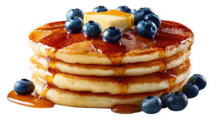 Stack of Pancakes: A delightful stack of fluffy pancakes drizzled with golden syrup, crowned with fresh blueberries and a pat of butter. Capturing the comforting essence of a hearty breakfast.