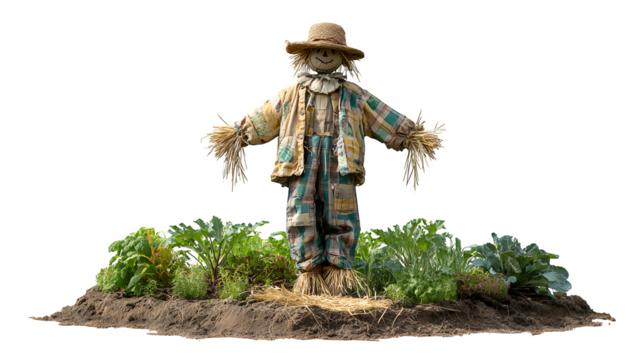 A traditional village scarecrow with straw stuffing and a patchwork hat, standing sentinel in a small vegetable patch, isolated on a Transparent background