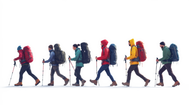 Winter hikers walking in colorful gear