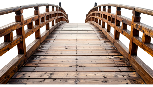 Wooden arched bridge with railings, showcasing perspective and leading into the darkness