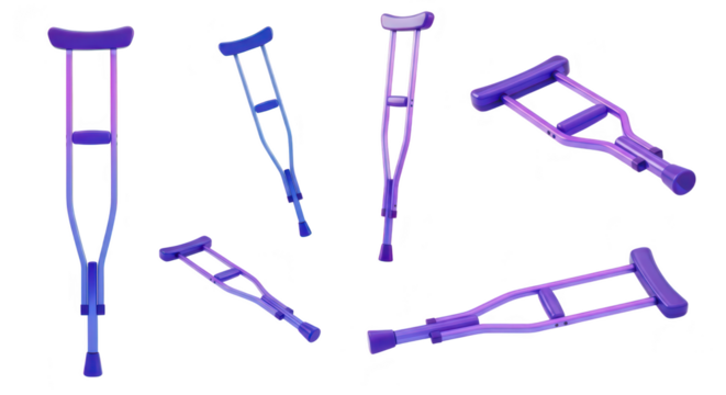 Assortment of multi-colored medical crutches arranged isolated on white illustrating recovery and mobility aids