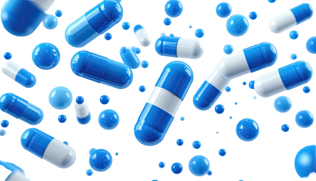 Blue and white capsules and spheres float on a dark background