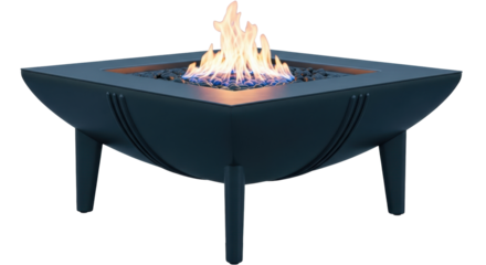 Isolated metal fire pit with fire rocks and flames, outdoor patio heater for evenings