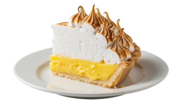 Slice of lemon meringue pie isolated PNG, delicious dessert with toasted meringue topping and creamy lemon filling for patisserie menu