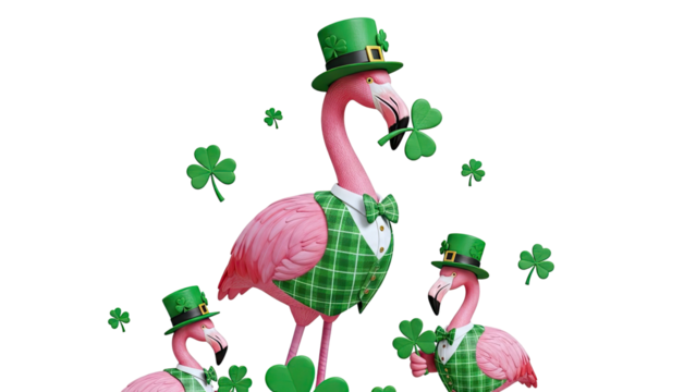 Flamingos in St. Patrick's Day Attire with Shamrocks