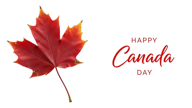 Vibrant red maple leaf and happy canada day text on a minimalist black background isolated on transparent background