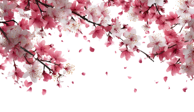 Pink and white blossoms cascade from branches.  Delicate cherry blossoms, some falling,  fill the image