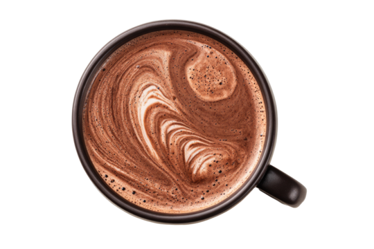 Overhead view of a dark brown mug filled with hot chocolate, exhibiting a swirling, abstract pattern on the surface