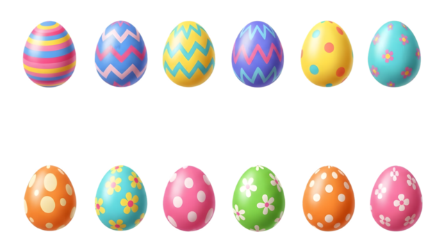 Set / Collection of Colorful Easter Eggs isolated on transparent background. Multicolor decorative design. Holiday April traditional celebration. PNG.