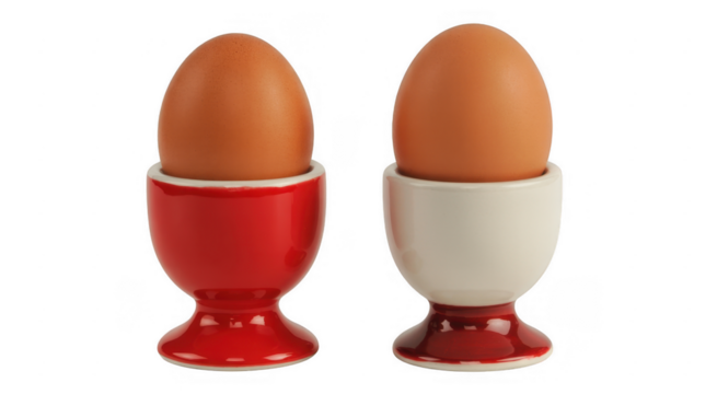 Two brown eggs in red and white ceramic egg cups isolated on a transparent background