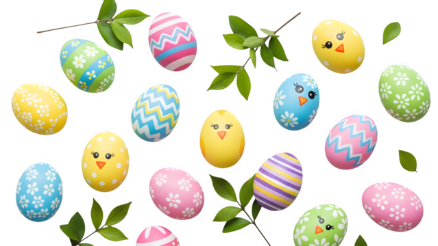 Easter eggs decorated in various colors and patterns isolated on transparent background