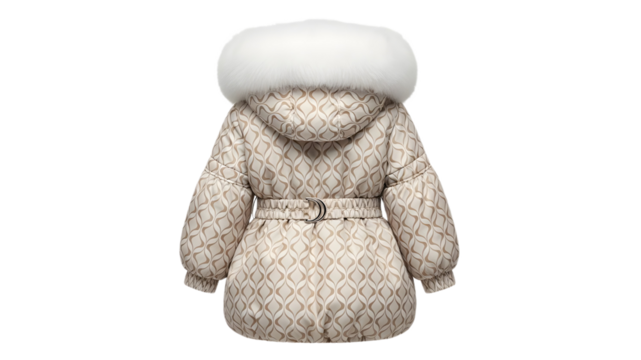 Beige and brown patterned quilted winter coat for a girl with a white furtrimmed hood and belt, back view isolated on transparent background