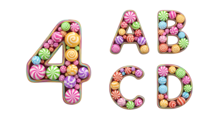 Three dimensional rendering of numbers and letters filled with vibrant, colorful candies. The playful design features a transparent background, ideal for graphic design.